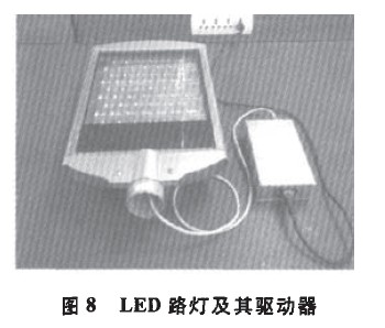 自动断开,整个控制电路工作,从而减少恒压电源的输出,当温度降低到48℃时,温度继电器自动闭合,并使电源正常输出。经过测试,得出驱动器Vo端与Trim端之间连接的总电阻值尺与驱动器输出电压Uo之间的关系,见表2??梢钥闯觯核孀诺缱璧脑黾?,输出电压呈减小趋势。当温度达到60℃时,图7控制电路中温度继电器Kt断开,此时,只要电阻匹配得当,我们便可以得到设定的输出电压。各阻值计算方法同上,在此不作具体计算。3试制驱动器实测结果本项研究进行了大功率LED路灯和LED投射灯及驱动器的研制工作。图8为LED路灯样灯及其恒流驱动器,灯体采用一体化设计,测得常温输入驱动器的交流电流为270mA,灯长时间运行状况良好,其总光通量为3 408 lm,在控温作用时,输出电流减小为常温的87%。图9为LED投射灯样灯及其恒压驱动器,测得常温下输入驱动器的交流电流为140mA,总光通量为1 011 lm,在控温作用时,电压减小为常温的90%。