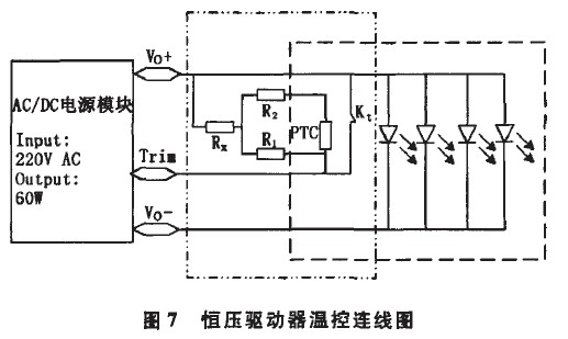 图7为恒压驱动器温控的连线图。Trim端用来调节电源的输出。左侧点线型虚线框中部分为控制电路,其中:PTC为正温度系数温敏电阻;R1、R2、R,均为普通电阻,与PTC温敏电阻匹配调节驱动器输出电压;Kt为常闭型温度继电器,其断开温度为60℃,自动闭合温度为48%。右侧虚线框中部分为LED模块部分。Kt和PTC安装在LED??樯?,并与模块紧密接触。常温下Kt处于闭合状态,此时控制电路中控制驱动器额定输出,该LED模组常温工作额定总电压为24V。当继电器温度上升到60℃时Kt