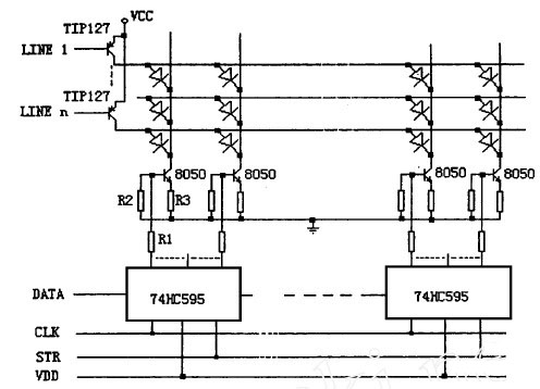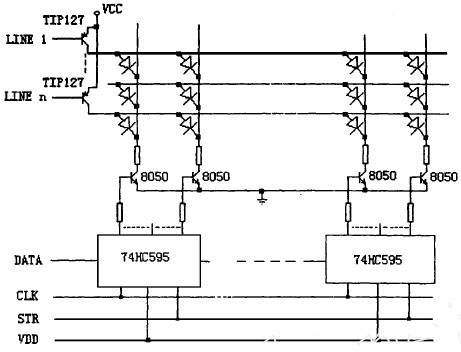 常规型驱动电路的设计一般是用串入并出的通用集成电路芯片如74HC595或MC14094 等作为列数据锁存,以8050 等小功率NPN 三极管为列驱动,而以达林顿三极管TIP127等作为行扫描管,其电路如图1 所示。