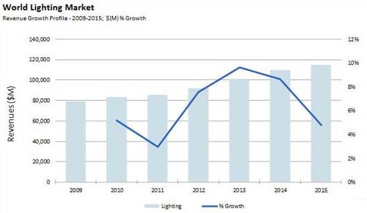 IMS Research的最新分析显示,2010年全球照明市场价值830亿美金,其中电光源部分占24%。到2015年,整个照明市场将会达到1150亿美金,电光源部分占到33%。