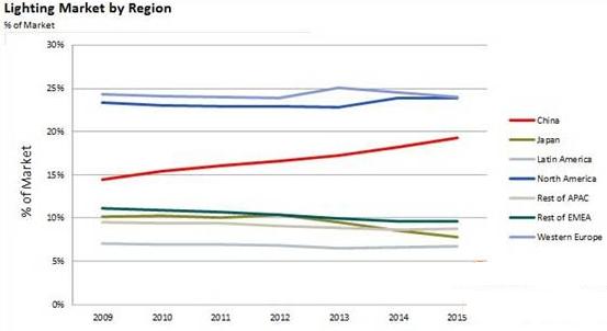 经济发达地区比如北美和欧洲将会是照明市场增长的主要区域,将会占到50%左右的市场份额($US)。2010年,中国占到全球照明市场的14%,2015年预计会增至20%。持续的经济增长,建设热潮,对于电力消耗增大的担忧以及公众购买能力的提升会影响该区域的市场。