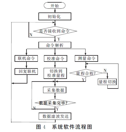 系统软件采用C语言编写,在IAR公司提供的集成调试环境Workbech下采用??榛枷虢猩杓啤O低车娜砑绦蚬袒贛SP430F149单片机的内部Flash存储器中。系统的程序流程如图4所示。整个流程可分为初始化、命令解析、数据测量、数据处理及显示程序。程序设计借鉴实时操作系统的思想,划分事件和目标。系统按照工作过程共有命令解析、联机、校准、测量判断、数据采集、数据打包发送等几个事件,通过对事件的处理来完成相应的功能,并进行必要的状态转换。当电压改变后,接收到测量命令,进入测量状态,将数据发送并显示,回到空闲状态继续等待命令然后进行相应的操作。