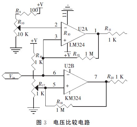 放大后的电压Vin分别输入单片机A/D通道和由LM324组成的上下限电压比较器,根据比较器输出分析信号幅度是否在规定范围内。为了使电路工作更稳定,比较电压值需预留一定的豁量。如图3所示,调节R10使比较上限电压为2.3V,调节R17使比较下限电压为0.1V,当Vin在0.1~2.3V时,量程合适,比较器输出逻辑电平00,启动A/D转换电路。否则,当Vin>2.3V时,通过模拟开关MAX312并配合软件来切换I/V转换电路的反馈电阻,向大量程切换;当Vin<0.1V时,向小量程切换,以适应不同强度的光信号。