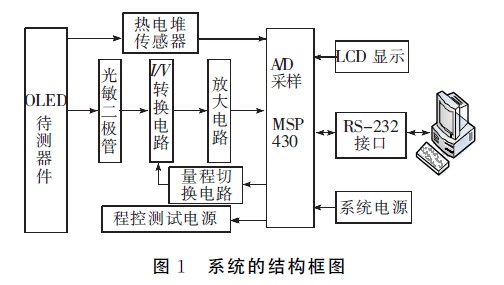 有机发光二极管(organic light emitting diode,OLED)是一种新型的平板显示器件和二维光源。通过测试OLED器件的电流-电压特性、发光亮度-电压特性、温度-电流特性、发光效率-电压特性、色坐标以及电致发光光谱等,可判断器件发光性能和电学性能的好坏,并计算出其外部量子效率和能量转换效率。目前较普遍的是采用直流电压表、电流表来测定OLED器件的电流、电压特性。利用微弱光光度计测定样品的发光亮度,利用温度采集仪测量样品的温度。