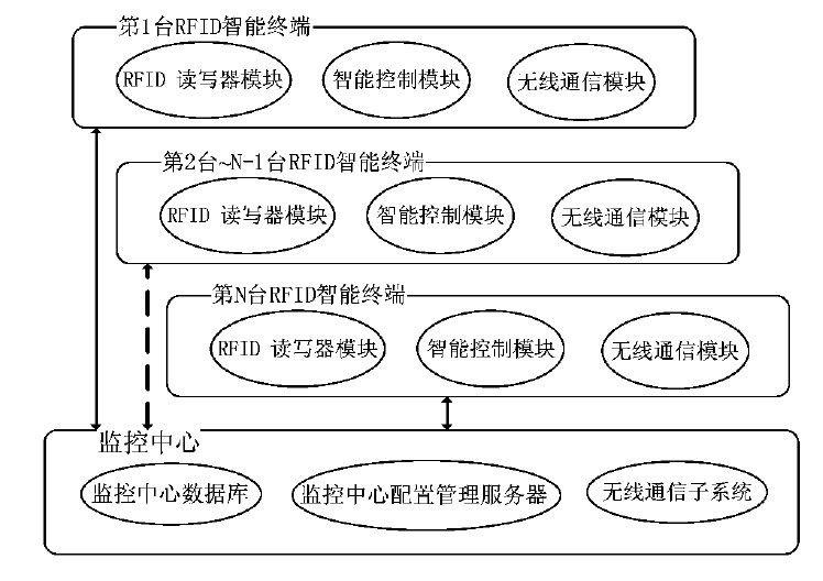 RFID 智能终端与监控中心服务器持续交换信息,包括更新追踪名单、上报标签信息、执行监控中心服务器的指令并返回执行结果,二者之间所有交互信息都有应答,消息全部采用加密方式,每次会话都经过双方相互认证的过程;RFID 智能终端在口令修改和程序远程升级时会中断其他业务处理,但不停止本机状态信息向监控中心服务器的传送。
