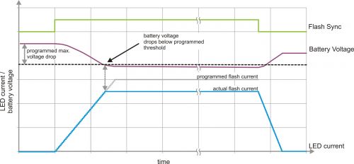 如果闪光灯驱动器本身能够防止电池电压下降过多,那么就可以保持较小的安全界限。通过使用一个受控转换率升高 LED 电流,并在上升期间持续监控电池电压可以实现这一目标。