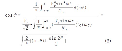 从式(5)可得电路的功率因数如式(6)所示,功率因数随可控硅的导通角的关系如图3b)所示。