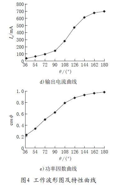 图4d)为可控硅不同导通角对应的输出电流曲线,实际调试中可控硅导通角在150°之后就接近满载输出了。图4e)为可控硅在不同导通角下对应电路的cosφ曲线。