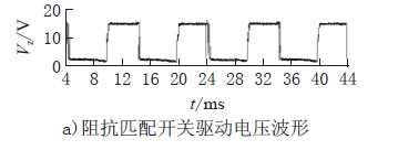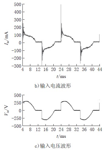 图4a)、b)、c)为可控硅导通角为115°时阻抗匹配开关驱动电压VZ、输入电流Iin、输入电压Vin的波形,电路的输出电流为470mA,功率因数为0.78。从图中可看出,当可控硅导通瞬间,由于驱动器输入端有差模滤波电容导致输入电流有冲击电流尖峰,而当输入电流小于一定值时,阻抗匹配开关开通以保证流过可控硅的电流大于其维持电流。