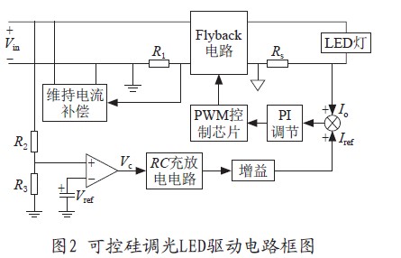 图2是一种利用普通的脉宽调制PWM芯片结合外围电路来搭建可控硅调光的LED驱动电路框图。维持电流补偿电路通过检测R1端电压(即输入电流)来控制流过维持电流补偿电路的电流。当输入电流较小时,维持电流补偿电路上流过较大的电流;当输入电流较大时,维持电流补偿电路关断,维持电流补偿以恒流源的形式保证可控硅的维持电流。调光控制电路包括比较器、RC充放电电路和增益电路。实验中选用一款旋钮行程和斩波角成正比的可控硅调光器,其最小导通角约为30°。