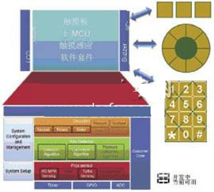 主要是用到MCU的内部的一些运算,用软件的方法实现检测,主要结构在软件算法,包括按键矩阵、转轮、滑条、键盘,有各种各样不同的算法来实现不同的按键类型检测。软件界面更加炫目,能以较低功耗实现接口方案。软件的解决方案面向应用,所以对API的接口设计充分,用户可以简单地应用到这些软件方案,与库文件进行接口。在方案中,考虑到各种按键的使用中情况,包括噪声抑制的算法,有内部的优化的缓存结构,支持64个电极任意排列的组合??梢栽谠诵械耐笨艋蚬乇杖我桓霭醇⒂凶远馗吹茸远迪值乃惴?,比如对粘滞按键、断路按键、乱按键的情况都有响应的自动算法处理。