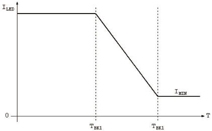 如图2使用LM3424所示,集成电路将在到达某温度时返送LED电流,此时,LED电流为零。这与LED作为系统中主要热发生器的情况不同。对于大灯组件等应用,设计师可能想要设置一项安全功能,即使LED可能在超出安全工作区的条件下工作,也始终能够提供光输出。对于此类情况,LED电流与温度曲线将如图4中示例所示。虽然LM3424没有这项内置功能,但这可以使用外部箝位电路轻松实现,并且防止TSENSE针脚上的电压低于预规定值。