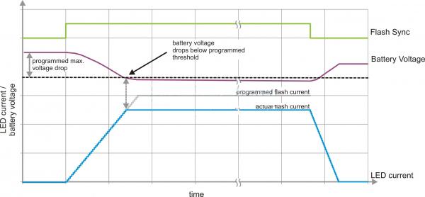 TI 拥有一种监控电池电压的闪光灯驱动器技术。要获得稳定的LED 电流波形并且避免过多的电池压降,闪光灯驱动器要主动控制LED 电流上升/下降顺序。在上升阶段(上升斜率为25mA/12µs),要对输入电压进行监控。如果输入电压降至某个设定阈值以下,则器件即刻停止让LED 电流进一步上升至该设定阈值,并将闪光灯电流保持在实际电平,参见图5。