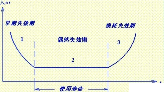 对可靠性的研究不能只停留在数据的测量和寿命的推算上,重要的是利用有效数据进行失效机理的分析。器件的失效分为早期失效,偶然失效,耗损失效三个阶段,服从浴盆分布曲线。如图1所示: