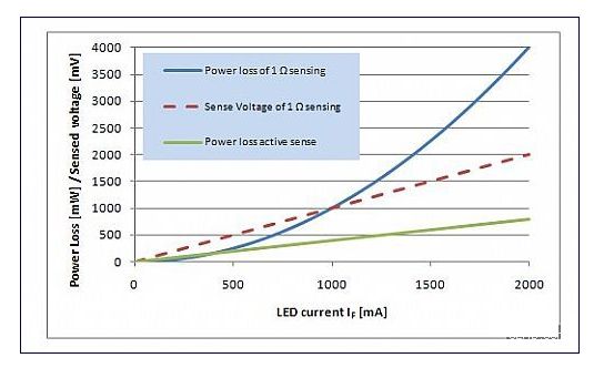 因此,更好的解决方案是一个集成在 LED 驱动器中的有源电流阱或者电流源,如图 3 所示。我们可使用一种压降和由此产生的功耗都得到降低的方法对内部电流检测电阻进行调节,具体调节情况取决于 LED 电流的大小。如果为低 LED 电流,则压降可以维持足够的高以获得精确的检测信号。