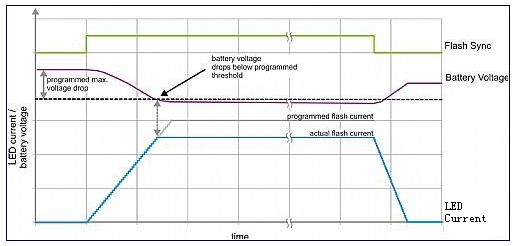 如果闪光灯驱动器本身能够防止电池电压下降过多,那么就可以保持较小的安全界限。通过使用一个受控转换率升高 LED 电流,并在上升期间持续监控电池电压可以实现这一目标。