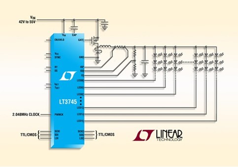 凌力尔特公司 (Linear Technology Corporation) 推出一个集成了55V 降压型控制器的16通道LED驱动器LT3745。该LED 驱动器为每通道加电至 75mA LED 电流,可驱动高达36V的串联LED,从而使该器件非常适用于诸如大型LED广告牌等应用。每个通道都有单独的 6 位点校正电流调节和12位灰度等级PWM调光。加上0.5μs 的最短LED接通时间,LT3745提供了非??淼亩员榷取5阈U盎叶鹊燃毒赏ü?TTL/CMOS 逻辑电路中的一个串行接口获得。LT3745 的 60V 至55V输入电压范围非常适用于商用和工业设计中的宽输入电源范围,一般在12V至48V之间。最少的外部组件加上6mm x 6mm QFN封装可为多通道 LED 应用提供占板面积高度紧凑的解决方案。