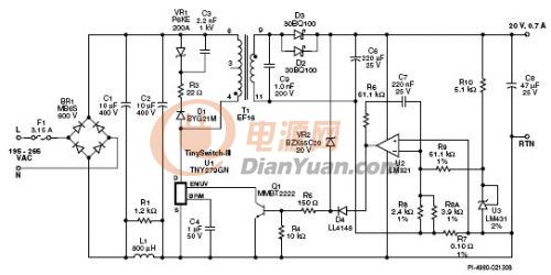 图1所示为一个典型的20 V、14 W恒压(CV)、恒流(CV)输出的电源电路。LED阵列的光输出量与所流经的电流量成正比。因此,LED驱动器应具有恒流输出,而不是恒压输出。在本设计中,DC输出未与AC输入隔离,因而LED阵列和外壳应与用户安全地隔离开来。