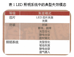 LED模组和灯具的典型失效模式包含了不同层次的失效模式,涉及到LED封装结构以及工艺过程(如表1)。LED在实际使用中,由于复杂的环境以及封装工艺局限性从而使封装材料退化、荧光粉退化、金属电迁移、局部温度过高产生的热应力所引起的芯片和硅胶的分层或金线断裂等等,从而影响LED发光甚至导致整个LED的失效。而且LED产生的高温会导致芯片的发光效率降低,光衰加快、色移等严重后果。
