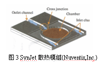 除了热界面外,主动散热系统已越来越受企业的欢迎。图3给出了SynJet主动散热???,它可以产生脉动空气,从而可以把LED灯内部的热直接带到外面。据了解,SynJet技术可以帮助设计师解决一些产品的散热问题,如电脑产品,特别是高可靠性的LED产品。该技术有高散热效率、低噪音、高可靠性和低功耗等优点。