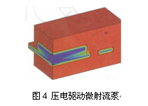 另一种主动冷却系统是利用压电驱动而产生脉动空气,如图4所示。该结构简单,由一个PZT膜片和流动通道构成。该流动通道中设计者重点论述了出口和进口通道的设计。这种结构允许每一个振动周期中的流体在管道中的阻力和动力差别。