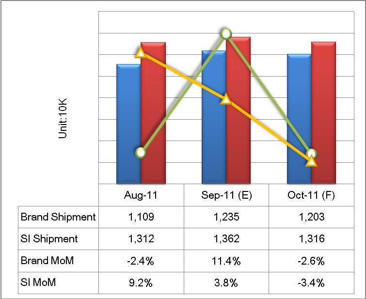 根据集邦科技(TrendForce)旗下研究部门WitsView全球前十大液晶监视器出货调查显示,前十大品牌厂商2011年8月在美系厂商因季初而导致出货动能疲软,加上终端消费市场需求依然平淡下影响下,MoM下滑至2.4%,为1,109万台。一如WitsView预期,8月份SI陆续接获第四季品牌短单及部分SI出货从谷底攀升下,呈现较高幅度之月成长,达9.2%。展望SI第四季出货,WitsView表示由于2012中国农历年在一月下旬较往年为早,为因应中国新年假期而引起的缺工问题,部分第一季需求将提前在第四季反应,QoQ出货将呈现小幅成长。展望品牌九月出货,除了季底需冲刺出货量及部分区域的教育市场订单释出外,品牌厂商亦摩拳擦掌为中国十一长假销售准备,因此WitsView预估九月将有9-12%出货成长空间。