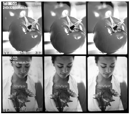 为了能更直观地比较16bit、18bit 和24bit 的显示效果差异,特地做了不同位深的手机显示效果对比,从左到右分别为1,600 万色、26 万色和65,000色,如图6 所示:在西红柿的高光部分1,600 万色色彩过渡平滑、自然,看不到不均匀的显示,26 万色的显示效果稍逊,而65,000 色能明显看出不均匀的显示。
