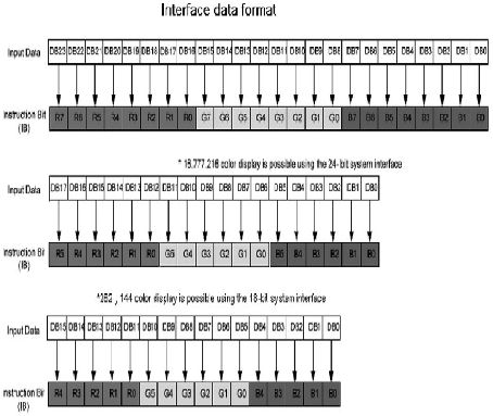 图4 显示了图片的数据是怎样实现灰阶的。第一个是典型的24bit 显示接口,数据通过GRAM 后转换成8bit Red、8bit Green 和8bit Blue.同理,18bit 的显示接口将数据转换成RGB 666,16bit 的显示接口将数据转换成RGB 565,继而混色成0到255 灰阶的不同色彩。