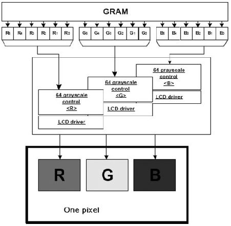 通过严格控制和改变液晶上所施加的电压,每种子像素呈现不同的灰阶。在结合了这三种子像素后,可以得到一个可以显示不同颜色的显示屏。