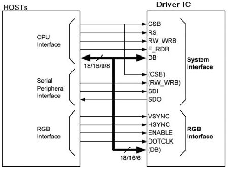 图2 显示了一个典型的主控端的连接方式,CS、RS、WRB、RDB 是控制型号,分别是片选信号、数据或命令、写/ 读信号,按照一定的时序控制,数据得以传输,画面才能正常显示。