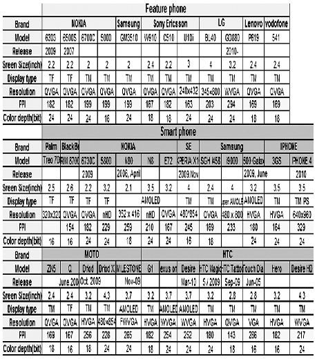 市面上所说的1,600 万色即24 位(bit),26 万色即18 位(bit),而65K 色也就是16 位(bit)。;图1中显示了市面上部分手机的颜色,可以看到,目前大多数手机厂商特别是手机大厂会选择24bit,也即1,600 万颜色。
