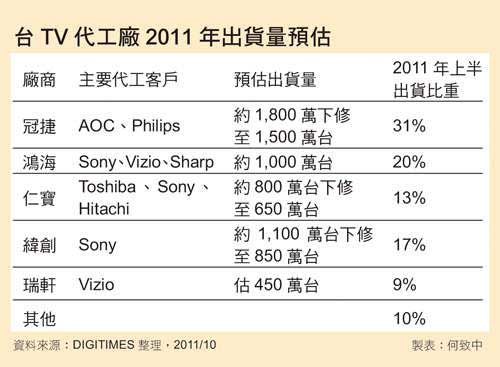 液晶电视制造龙头冠捷虽握有自有品牌AOC与飞利浦(Philips)品牌订单,但亦因整体市场需求不佳,下调2011年出货量,从原先1,800万台下修至约1,500万台;纬创第3季表现虽相对较佳,出货量仍逐月成长,一路从55万台爬升至80万台,然近期亦将全年液晶电视出货量从1,100万台下修至约850万台;至于手握Sony液晶电视订单的鸿海,2011年也面临出货量下修窘境。