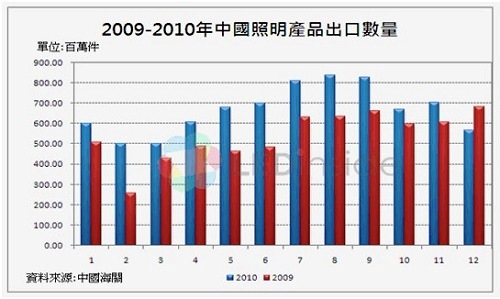 集邦科技旗下研究部门 LEDinside 研究指出,中国目前已成为照明灯具产品的制造大国,将近70%的照明产品都是由中国地区所生产,以白炽灯来说更是如此。LEDinside调查指出,2010年白炽灯、卤钨灯、(紧凑型热阴极)萤光灯与其他灯具的每月平均出口数量达6.67亿件,金额达11.40亿美元;总计2010年出口数量达79.9亿件且金额达136.77亿美元,相较於2009年,数量成长24.2%,且金额成长34.7%。