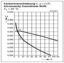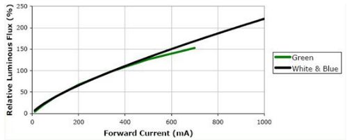 由图中可以看到,如果正向电流从350mA降低8.75倍到40mA,其相对发光强度将从100降低到20。降低将近5倍。显然这是完全不能允许的。所以一定要把电流恒定。