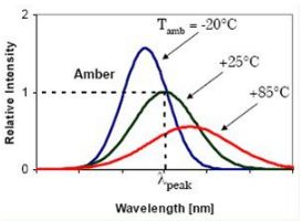 而且当温度变化时,LED的发光光谱也会发生变化。通常温度增加时光谱的最大值是向波长长的方向漂移。大约是每升高10oC时漂移1nm,升高50度会产生5nm的变化(见图6)。