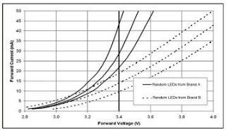 从图中可以看出,假如采用恒压电源供电,它们之间的正向电流就会有很大的差异。而过大的正向电流也会导致光衰的加速,所以一定要用恒流源供电。