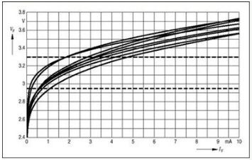 即使是同一型号的LED其伏安特性在各个个别的器件之间也是不同的,更何况在不同生产厂家之间就更是不同了(图8)。