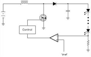 图中显示了一个基本的电感升压电路,其中控制器(Control)给出了一个PWM开关信号来控制大功率开关管,后者在导通时对电感充电,而在断开时电感中的能量就对电容充电。经过几次开关以后就可以把输入电压泵至更高的电压,从而完成升压的任务。改变PWM信号的工作比就可以改变其输出电压。为了保持输出电流的恒定,就要求测量输出电流值,这是靠一个和LED串联的小电阻来测量的。这个电阻上的电压就和一个参考电压相比较,比较所得出的误差信号就送去控制器用以改变PWM信号的工作比,这样就实现了一个闭环自动控制,以控制其输出电流为恒定。
