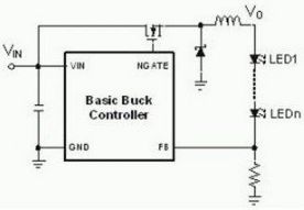 通常储能电感是和LED串联,开关导通时,电感储能;开关断开时电感通过二极管继续有电流流通。由于输出电压是输入电压减去电感电压,所以是降压型。LED中的电流经过检测电阻测量以后反馈回控制器。来控制PWM的工作比,以实现恒流的控制。