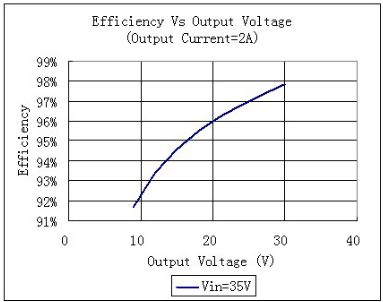 降压型恒流源的缺点是要求输入电压高于输出电压,而太阳能LED路灯中所采用的蓄电池往往是12V,顶多是24V。而路灯中的LED通常是10个串联,其所要求的总输出电压往往在33V-36V左右,因此较难采用降压型的恒流源。而降压型恒流源的优点是效率高。因为输入电压高于输出电压,所以输入电流小于输出电流。电流小有助于减小电阻性损耗。图15表明一个降压型恒流源在输入电压固定在35V,输出电流固定在2A时,其效率和输出电压的关系曲线。