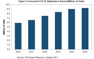 据IHS iSuppli公司的电视研究报告,随着青睐先进电视技术的中产阶级不断壮大,今年俄罗斯液晶电视出货量预计强劲增长10%。俄罗斯属于所谓的金砖国家(BRIC),是一个重要市场。