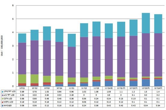 拓墣表示,目前生产像素数超过WVGA高分辨率手机面板,需要采用LTPS TFT基板生产线,2010年智能手机用TFT LCD面板的出货量,TMD(Toshiba Mobile Display)和Sony Mobile Display两家业者遥遥领先,分别占30.2%及21.0%,而韩国SMD占18.4%,Sharp占16.3%,台厂仅拿下5.6%,其中日系面板厂所占的比重接近70%。因此,不论功耗与视觉极限问题,目前高分辨率显示面板市场需求情况对日、韩系面板厂而言的确相当有利,并藉由高端规格来提倡LTPS TFT技术,远远拉开其它竞争对手的追赶。