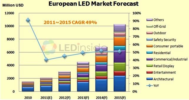 根据LEDinside调查, 2011年欧洲 LED照明市场约达20亿美元以上,大约占全球 LED照明市场28%。尽管欧洲市场因为欧债而在 2011年有受到影响,但欧盟已经积极解决,也反应在市场上,随着LED规格不断的提升及大幅度降价等影响,LEDinside预估欧洲 LED照明市场每年都将会有大幅度成长,2015年欧洲 LED照明市场将会突破100亿美元规模。