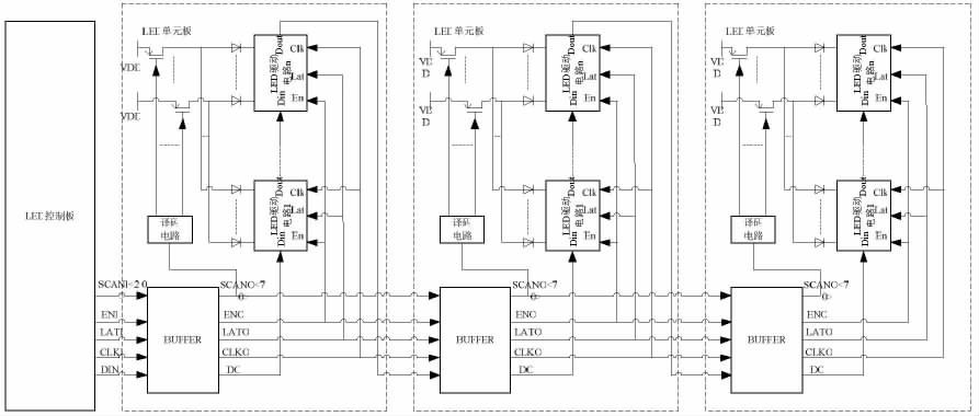 LED 控制板与LED 单元板构成的LED 显示系统的主体,如图1 所示。其中,LED 单元板包括了增强信号驱动能力的BUFFER 电路、产生动态显示扫描时序的译码电路、若干个开关管和若干个LED 驱动电路。其通信过程为:LED 控制板发出的通信信号依次经过各串接的LED 单元板的BUFFER 电路进行驱动增强;各LED 单元板中经BUFFER 电路增强后的扫描信号(SCANO)提供给本LED 单元板的译码电路,译码电路译码产生动态显示扫描时序控制开关管;各LED 单元板中经BUFFER 电路增强后的使能信号(ENO)、锁存信号(LATO)、时钟信号(CLKO)分别提供给本LED 单元板中所有LED 驱动电路。