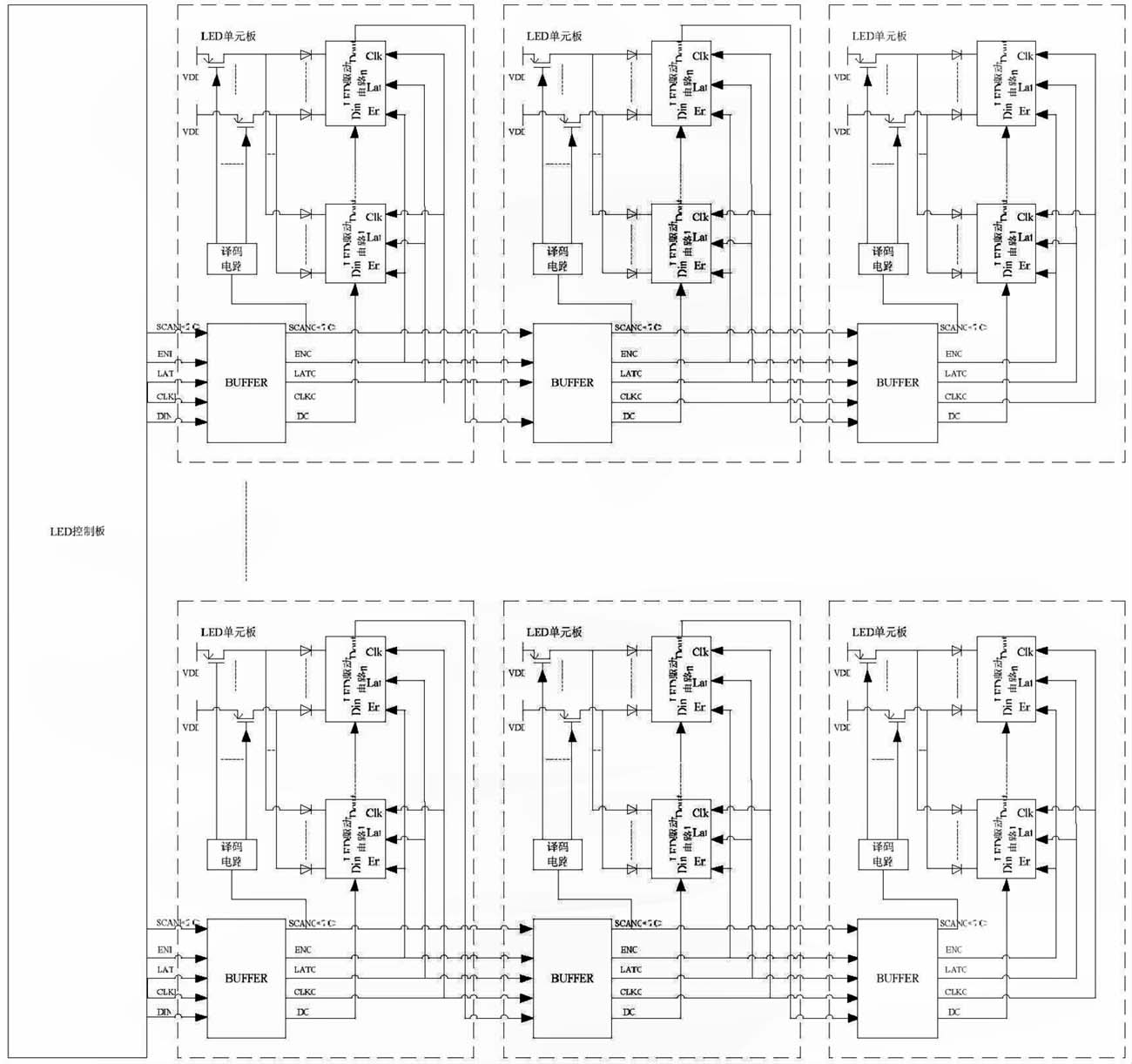 定义LED 通信电路包括通信信号输入端、通信信号输出端、动态显示扫描时序输出端(SCAN<7:0>)、控制信号输出端(En、Lat、Clk)、数据输出端(DATAOUT);定义通信信号包括通信信号输出指令、动态显示扫描时序解析指令、控制信号时序控制解析指令、数据;各LED 单元板上LED 通信电路根据接收到的通信信号,解析出通信信号输出并经通信信号输出端提供给下一个LED 单元板的LED 通信电路的通信信号输入端;各LED 单元板的LED 通信电路根据接收到的通信信号,解析出动态显示扫描时序并经动态显示扫描时序输出端(SCAN<7:0>)控制本LED 单元板的开关管;各LED 单元板的LED 通信电路根据接收到的通信信号,解析出控制信号时序并经控制信号输出端(En、Lat、Clk)控制本LED 单元板的LED 驱动电路;各LED 单元板的LED 通信电路根据接收到的通信信号,解析出数据,经数据输出端(DATAOUT)提供给本LED 单元板的第一驱动电路数据信号输入,本LED 单元板的各LED 驱动电路的数据信号输出连接下一个LED 驱动电路的数据信号输入,最后一个LED 单元板的LED 通信电路的通信信号输出端悬空或者返回到LED 控制板。