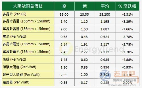 而在电池方面,最低价格仍来到每瓦0.43美元,平均价格则滑落到每瓦0.524美元,跌幅为2.78%;另外在模组方面,虽然矽晶太阳能模组的平均价格持续下滑到每瓦0.935美元,跌幅为4.88%;而薄膜部分也是下滑的状况,平均价格来到0.856美元,跌幅为0.93%。