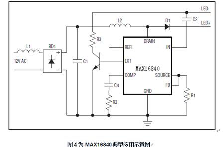 而MAX16840芯片有3个重要引脚功能:FB引脚电压可检测输入电流,并调节其平均值;而输入引脚(REFI)用于设置输入电流值,引脚电压低于特定门限时,输入电流与该电压成正比,电压超过特定门限时,输入电流将置于固定的预置水平。据此利用REFI的非线性特性,连接一个NTC电阻,即可得到热折返保护;IN引脚具有内部过压?;?,避免内部开关MOSFET在LED串开路或LED串电压过高时损坏;它带有一个独立的EXT引脚,确保低输入电压开启时提供一个触发启动电流,以配合电子变压器正常工作。EXT驱动外部npn晶体管,一旦IN跌落到5.5V UVLO门限以下,将EXT拉至地电平,外部npn晶体管关断。其IC采用3mm x 3mm、10引脚、TDFN封装,-40°C至+125°C工作温度范围。图4为MAX16840典型应用示意图。它被广泛应用于MR16及其它12V交流或直流输入LED照明之中。