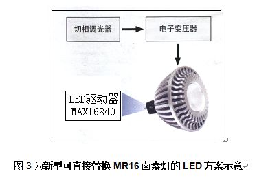 *构建方案:它应用了新型MAX16840型LED驱动器,该芯片的架构,使用了电子变压器和切角调光器以实现无闪烁调光,形成了独特的LED驱动器方案,从而可实现兼容大多数电子变压器和切角调光器MR16的LED灯设计。它在技术上确保无需对现有电路架构做任何修改就可用LED换代灯直接替换MR16卤素灯。该方案为市场应用扫除了一大障碍,使终端用户能够以极低的配置成本获得LED照明的全部优势,即:是一种确保无闪烁并可调光操作,又能兼容于绝大多数电子变压器和切角调光器,可直接替代MR16的LED换代方案;更无需更改现有的电气架构,又缩小板尺寸并降低BOM成本。那末LED换代灯构建设计是如何实现呐?