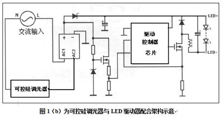 所以它是LED照明常用方法,见图1(b)所示可控硅调光器与LED驱动器配合架构示意。
