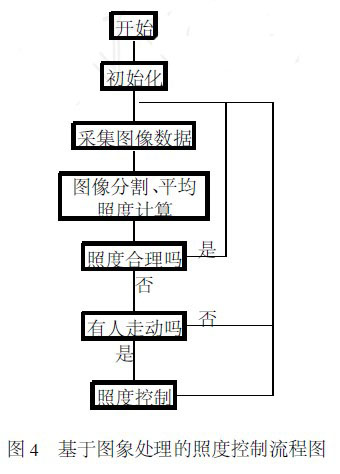 基于图像处理的程序流程图如图4 所示。初始化系统后, 经过采集图像数据, 将采集来的数据进行计算:先进行图像分割, 然后进行图像特征提取,区分亮区和暗区, 计算平均照度。判别照度值是否符合要求:如果照度值符合要求, 重复采样图像数据; 如果照度值不符合要求, 就输出控制信号来调节灯的亮度, 之后, 重复采样图像数据, 进行下一个循环。